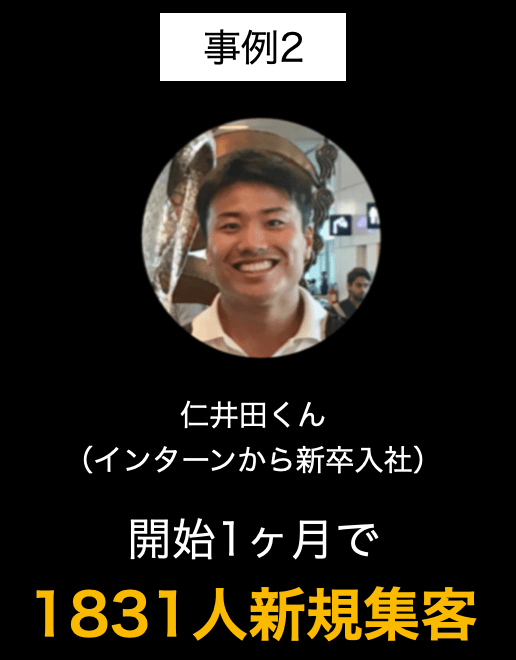 そして、これがウチに入ってきて間もない新人でも、すぐに成果を出せる理由で、本当に成果が出るものだけを厳選して、新人にやってもらっているから、業界未経験の新入社員でもすぐ成果をだすことができます。(事実、前職が“学校の先生”や“栄養士”など、全く関係ない業界から転職した人や、社会人経験のない学生でも、1ヶ月、2ヶ月、3ヶ月という短期間で成果をだしています)この公式に沿って、実践するだけなので、身につけないといけないことが本当に少ないんです。